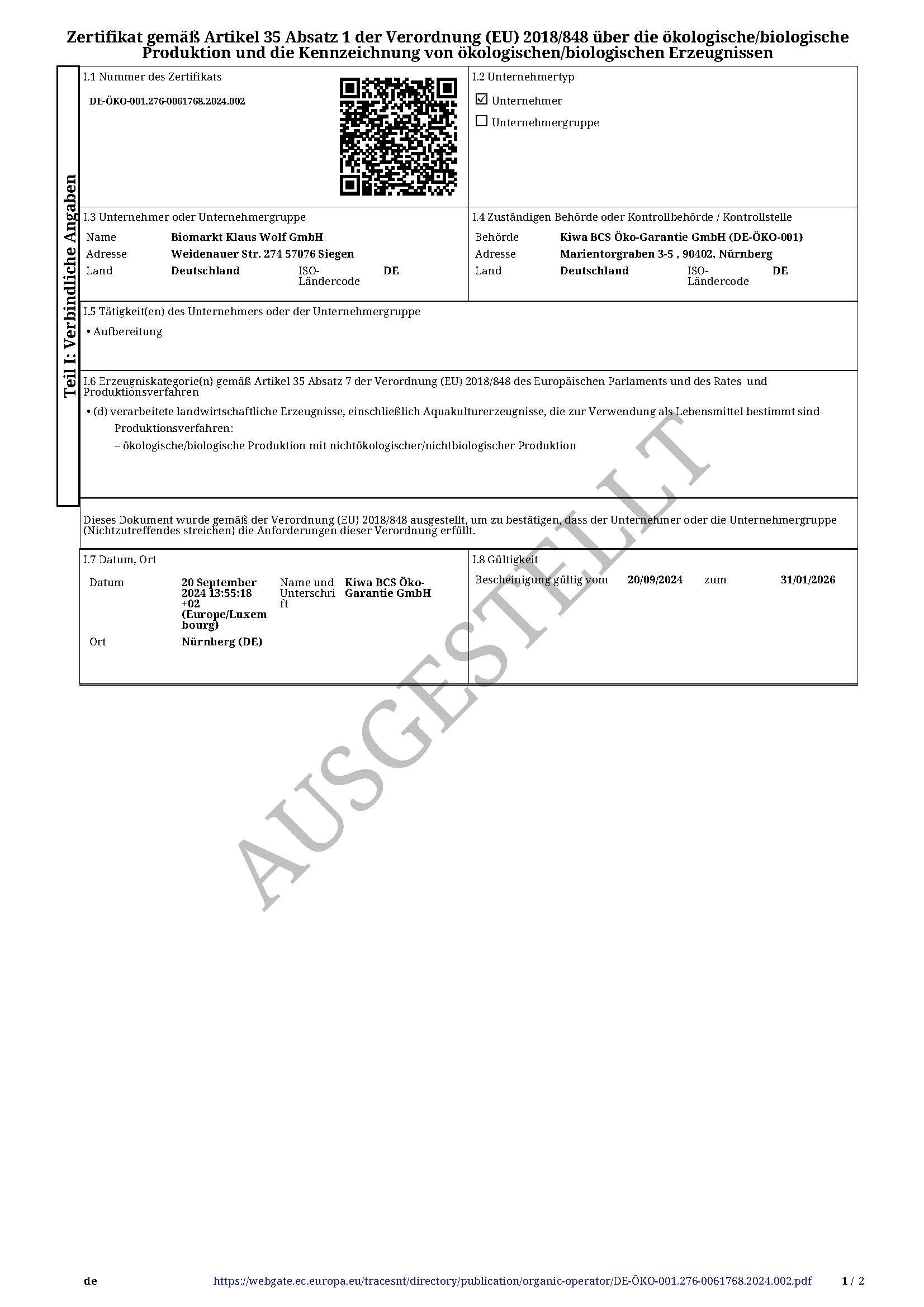 Zusätz­lich lassen wir uns regel­mä­ßig von der renom­mier­ten Kiwa BCS Öko-Garan­tie GmbH zerti­fi­zie­ren. Dieses Zerti­fi­kat steht für höchste Standards in der ökolo­gi­schen Produk­tion und garan­tiert Ihnen authen­ti­sche Bio-Quali­tät, der Sie vertrauen können.